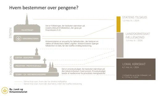 Det er illustreret nedenfor, hvem der har ansvaret for fordeling af folkekirkens indtægter fra kirkeskatten og statens tilskud.