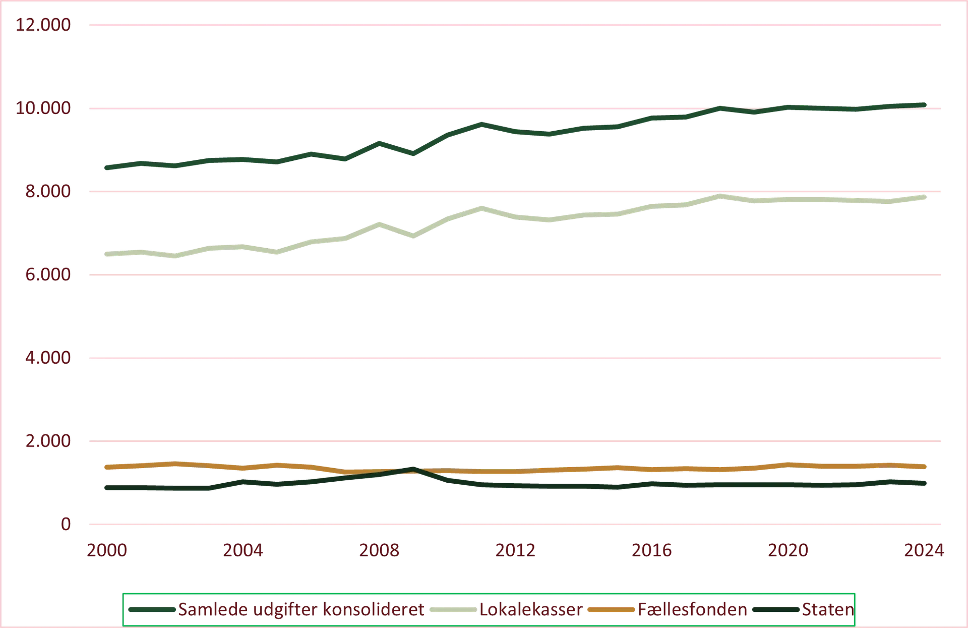 Figur 3: Samlede udgifter set over år, dernæst fordelt på de lokale kasser, Fællesfonden og Staten (Millioner kroner faste priser, pl 2024)