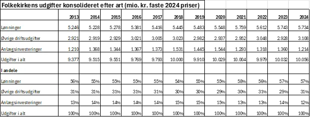 Tabellen nedenfor viser, hvordan folkekirkens samlede udgifter fordeler sig over år på henholdsvis løn, øvrige driftsudgifter og anlægsinvesteringer.