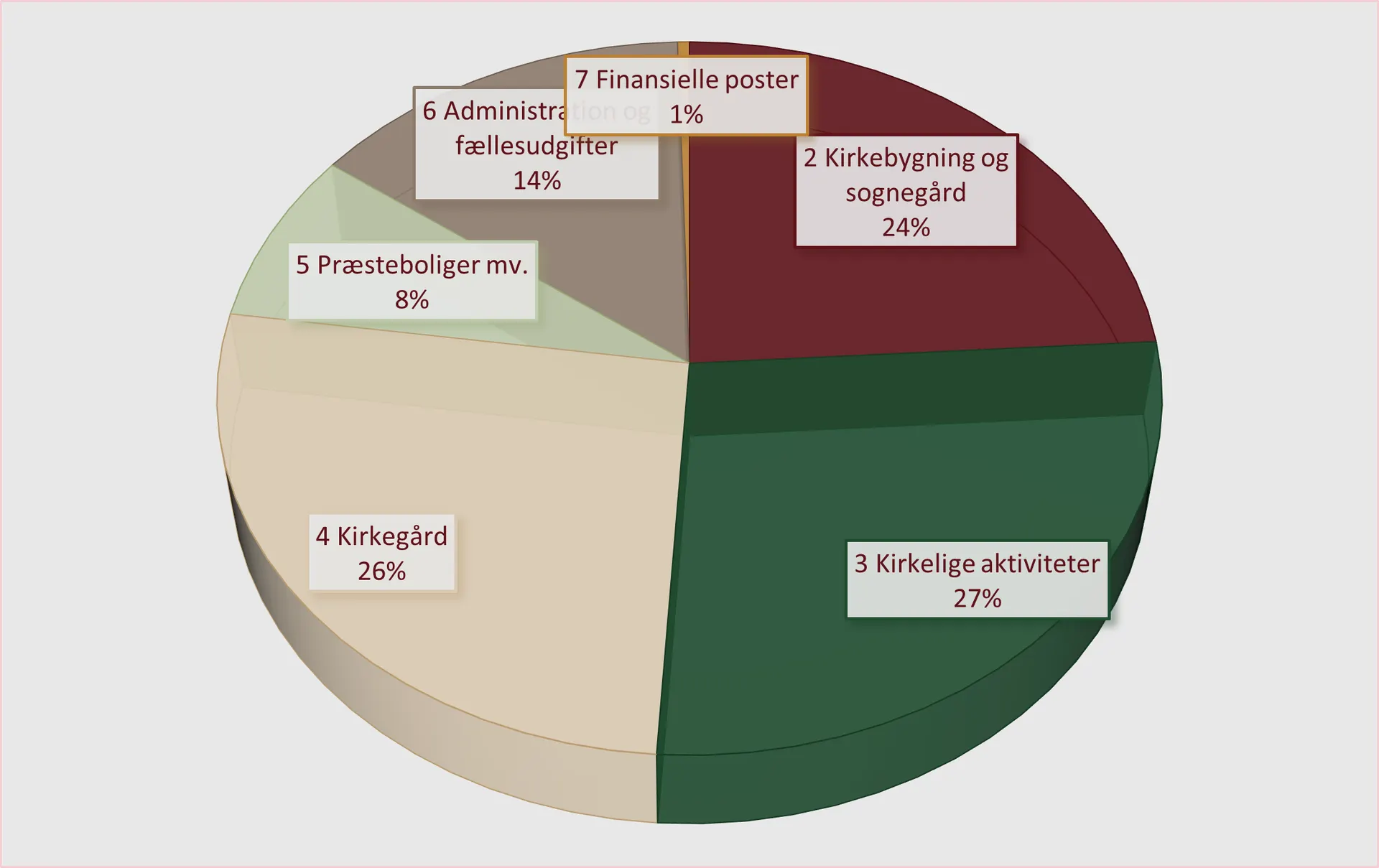 Figur 6 viser de lokale kassers udgifter fordelt efter formål, hvor f.eks. lidt over en fjerdedel af udgifterne er knyttet til kirkelige aktiviteter. Andre store udgifter er blandt andet udgifter til kirkebygninger og sognegårde samt administration og fællesudgifter.